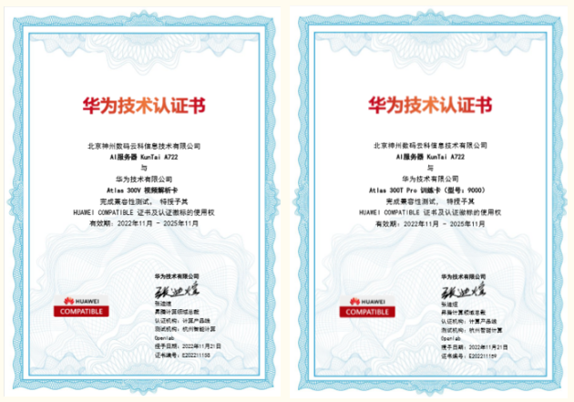 近期,豪门国际KunTai A722服务器顺利获得华为“Atlas 300V 视频解析卡”以及“Atlas 300T Pro 训练卡(型号:9000)”两项技术认证,为智能算力再添新力!